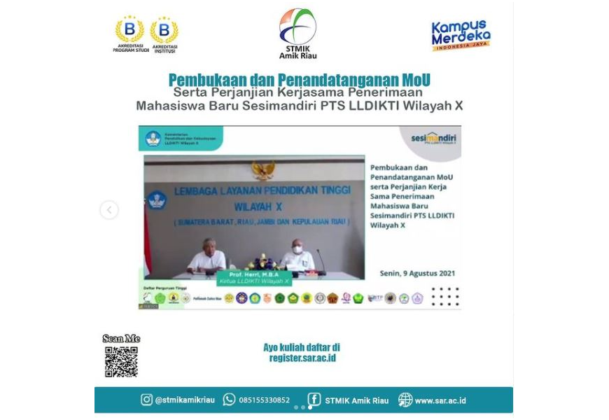 Didukung oleh Lembaga Layanan Pendidikan Tinggi (LLDIKTI) Wilayah X dan 20 perguruan tinggi swasta, STMIK Amik Riau menyelenggarakan program penerimaan mahasiswa baru seleksi bersama Sesimandiri. Pembukaan program ini dilakukan secara daring, Senin 9 Agustus 2021.