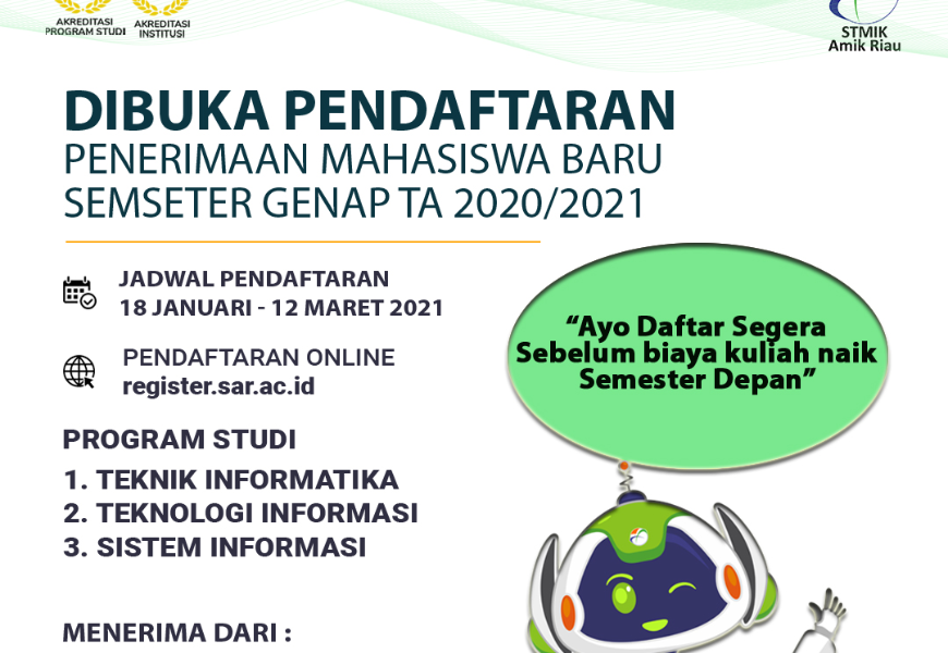 Penerimaan Mahasiswa Baru Semester Genap TA 2020/2021 Posted by Admin | Selasa 19 Januari 2021 10:49:40 1493 Dilihat Berita Penerimaan Mahasiswa Baru Semester Genap TA... Selengkapnya