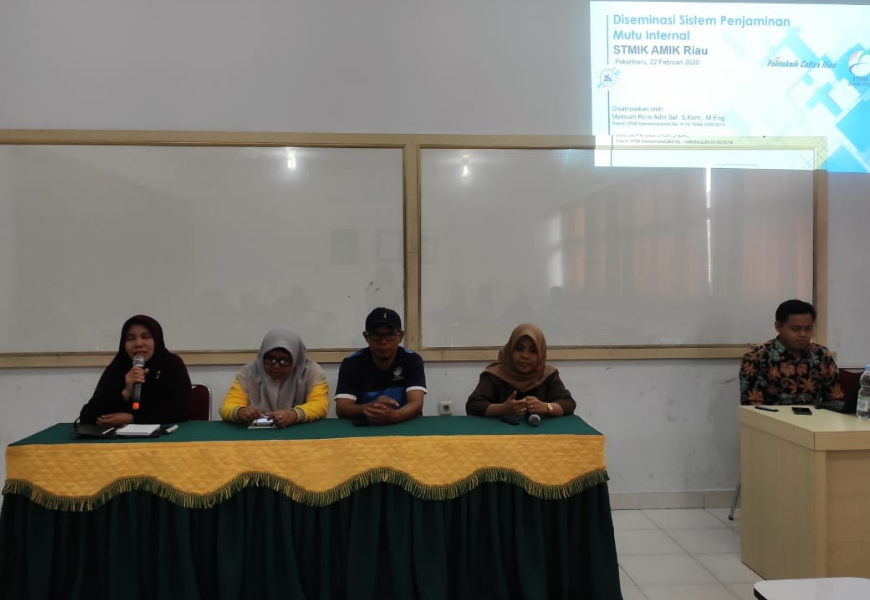 Pekanbaru(22/02/2020), Diseminasi Sistem Penjaminan Mutu Internal (SPMI) STMIK Amik Riau berlangsung di Ruang 16 Gedung Perkuliahan. Acara yang dihadiri oleh Wakil Ketua I Bidang Akademik dan Kemahasiswaan Bapak Susandri, M.Kom, Wakil Ketua II Bidang Kepegawaian dan Administrasi Umum Ibu Rahmiati, M.Kom, Kepala Bidang Penjaminan Mutu Ibu Susi Erlinda, M. Kom, Seluruh Unsur Pimpinan di lingkungan STMIK Amik Riau, seluruh Dosen, Karyawan dilingkungan Sivitas Akademika STMIK Amik Riau. Dengan mengundang narasumber dari Fasilitator Pusat Penjaminan Mutu dari Politeknik Caltex Riau (PCR) yaitu Maksum Ro’is Adin Saf, S.Kom., M.Eng, dan Istianah Muslim, S.T., M.T., dan Istianah Muslim, S.T., M.T., acara ini bertujuan untuk menyamakan persepsi para pimpinan di STMIK Amik Riau tentang Sistem Penjaminan Mutu terutama yang terkait dengan Permenristekdikti nomor 62 tahun 2016 tentang Sistem Penjaminan Mutu Pendidikan Tinggi.