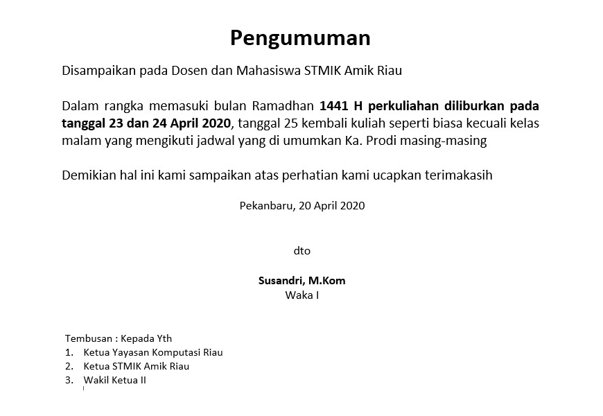 Pengumuman Libur Awal Ramadhan 1441 H Posted by Admin | Senin 20 April 2020 14:34:25 1216 Dilihat Pengumuman ... Selengkapnya